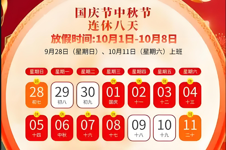 国庆节放假安排:10月1日(周三)至8日(周三)放假调休,共8天。9月28日(周日)、10月11日(周六)上班。 请各部门提前妥善安排好工作事宜、安全和应急处理等各项工作。假期期间安排安装事宜正常进行,服务热线13862123624 13862127416